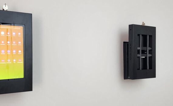 Nosso modelo de suporte para tablets Compact CD possui a particularidade de conter o carregador do tablet alojado dentro da estrutura metálica, sendo antifurto e antivandalismo. Feito para instalação em paredes. Neste exemplo, adesivado em alta resolução.