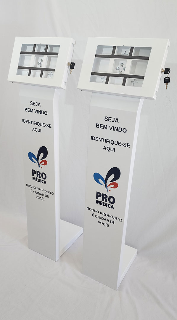 Tótens usados na recepção de empresas para consultas.